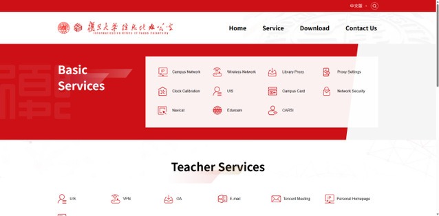 信息办英文主页采用全英语界面设计,兼顾信息办全业务与阅读舒适度,为全校师生打造无障碍信息通道,让信息化服务跨越语言边界。创新分屏布局打破传统框架,首页导航栏精准分类「服务」「下载」「联系我们」,右上方有站内搜索栏,指尖点击间实现信息高效检索。滑动首页可快速浏览「基础服务」「教师服务」「学生服务」「下载专区」栏目,eHall、邮箱、VPN等信息化业务全都有,常用服务突出显示,一键直达便捷高效。