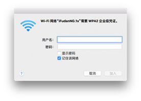 2) 点击iFudanNG.1x,在弹出窗口中输入无线网络帐号信息,802.1x选择自动,并勾选“记住该网络”,点击“加入”则会保存设置并自动连接;
