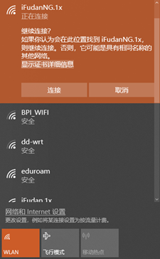 1、点击右下角网络图标打开网络选择列表,等待搜索到iFudanNG.1x信号,选择并点击“连接”,然后输入无线网络账号信息,点击“确定”;