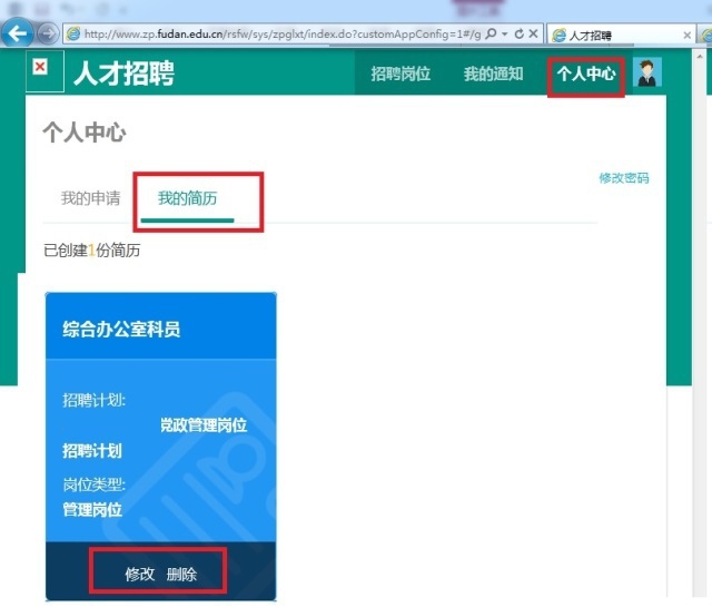 点击“个人中心”点击“我的简历”--“修改”后在系统开放时间段内重新提交即可。