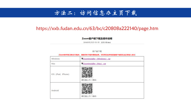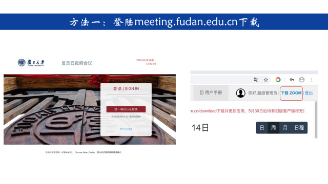 为便于您更快速地下载安装官方版Zoom软件,学校在云视频会议平台(http://meeting.fudan.edu.cn)、信息办门户网站(https://xxb.fudan.edu.cn/63/bc/c20808a222140/page.htm)均提供下载链接,具体操作方法如下: