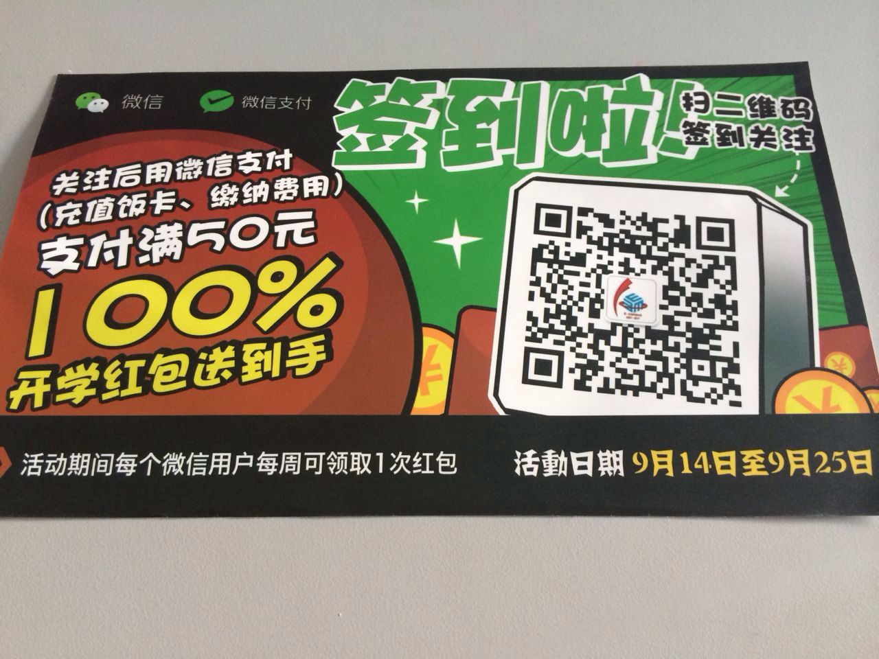 即日起至9月25日,关注“复旦信息办”公众号,用微信进行一卡通充值或其他缴费,支付满50元(含)100%得开学红包,金额随机,最高18.88元,每个用户每周可领取一次红包。一卡通充值完成后,请到一卡通自助服务终端领取充值金额。