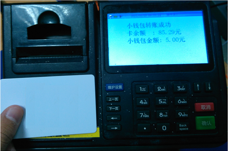 操作方法:只需将卡放置于感应卡处,显示转账成功即可,每次刷卡转账金额固定为5元,如图。