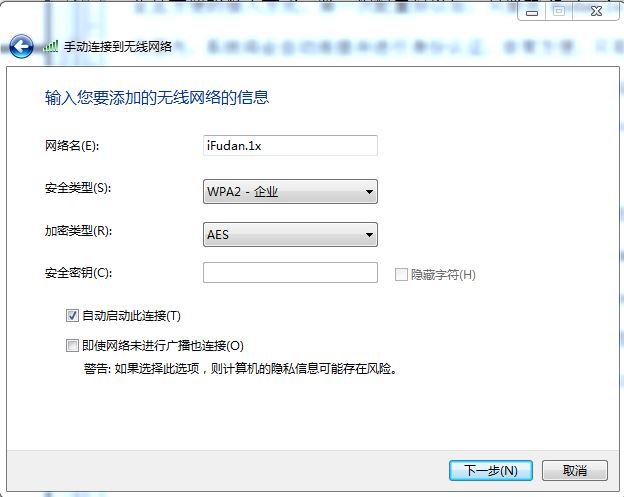 4.输入网络名“iFudan.1x”,安全类型选“WPA2-企业”,其他为默认,点击“下一步”;、
