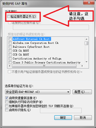 7.点击“设置”进入“受保护的EAP属性”设置,不勾选“验证服务器证书”;点击“配置”进入“EAP MSCHAPv2属性”设置,不勾选“自动使用Windows登录名和密码”;