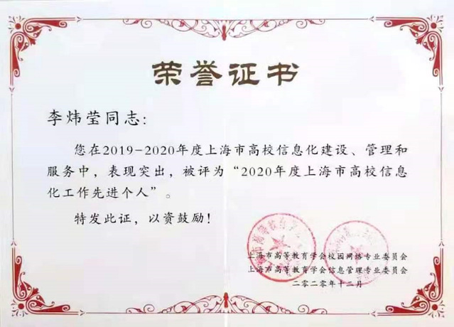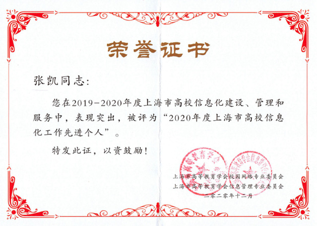 经专家评审,开云电竞平台app官方网站下载张凯同志、李炜莹同志被评选为“2020年度上海市高校信息化工作先进个人”。