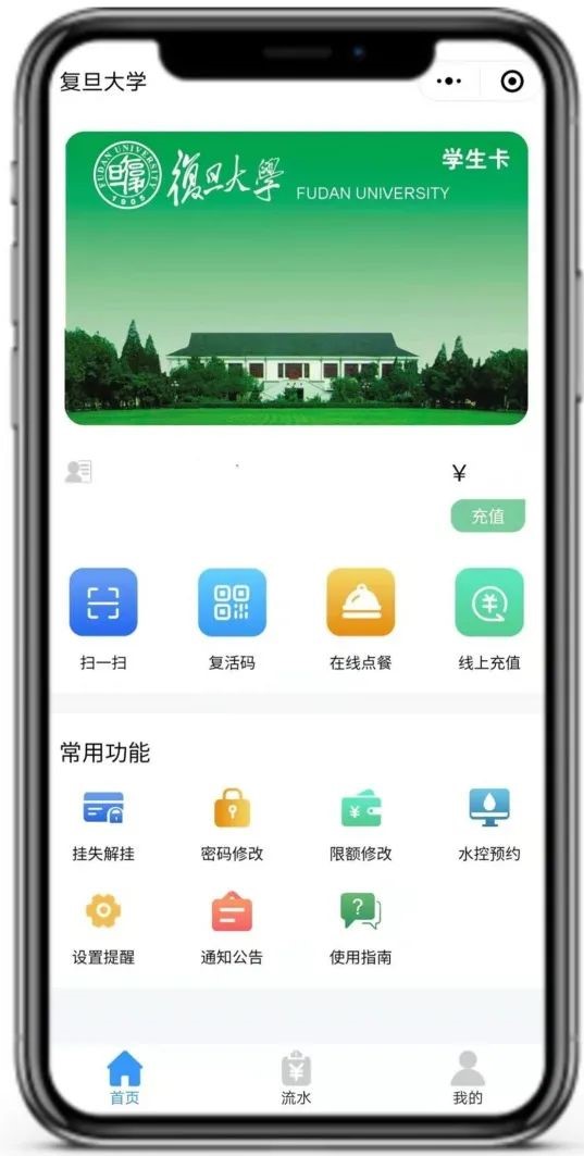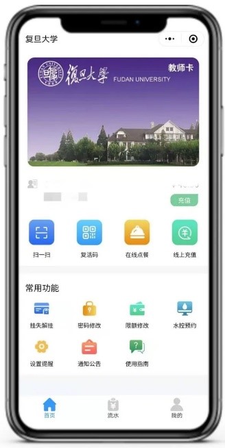 “复旦eCard”小程序提供“复旦生活码”、扫一扫、线上充值、在线点餐、挂失解挂、密码修改、限额修改、设置提醒以及流水查询等众多功能,大大改善了用户体验。线上充值即时到帐,挂失解挂在线完成,“复旦生活码”可以在食堂和其它校内商户进行扫码支付,也可用于四校区校门岗、校车等场景下的身份识别,获得了师生的广泛好评。