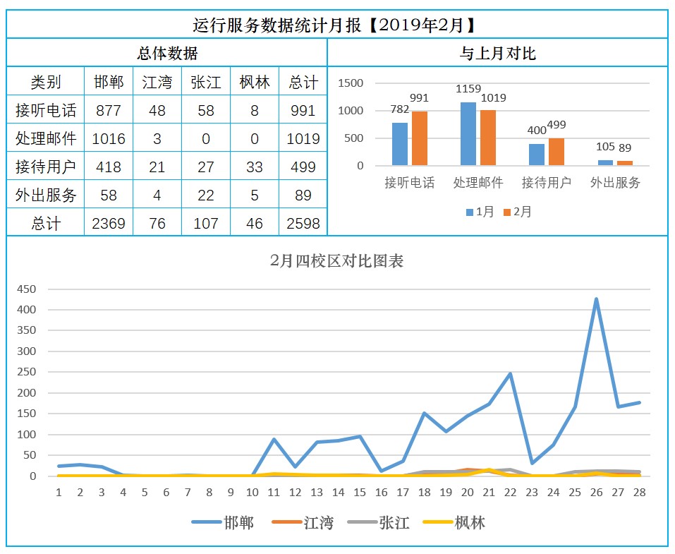 20192月,信息办服务台的运行服务总量共计2598件。根据统计数据,四校区共接听电话991通,处理邮件1019封,接待用户499/次;外出服务89次。本月用户集中咨询问题类型:邮件系统、学生宿舍网络、统一身份认证(UIS)、无线网络、收费平台以及生活服务平台等。