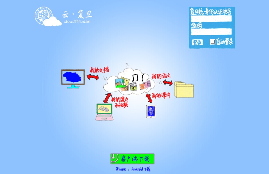 “云·复旦”是开云电子官网信息办为广大师生打造的多终端云存储平台,集成统一身份认证(UIS),为每位在校师生提供50GB的云存储空间,支持校外访问,目前已正式对外提供服务。“云·复旦”向师生们提供安全高效的个人数据和教学科研数据存储分享服务,提供文件管理及备份、文件共享与资源群组,用户可将相同文件即时自动同步至PC、移动设备和Web,并分享给其他人。使用IOS操作系统的用户请在App Store中搜索“云复旦”下载安装应用,其余用户可以通过Web浏览器访问http://cloud.fudan.edu.cn下载“云·复旦”客户端。使用中如有问题,请发邮件至cloud@fudan.edu.cn。