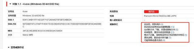 对该文件进行检测,该文件标注为高风险,并且具备多项威胁特征,同时也列出了病毒检测名Ransom.Win32.FAKEGLOBE.JKPN: