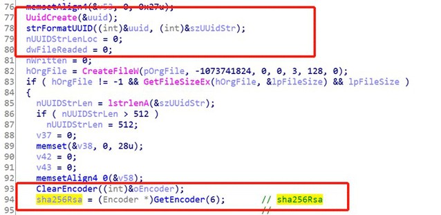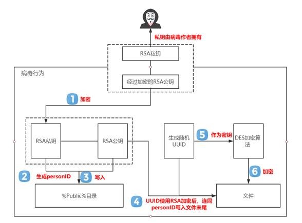 首先,病毒通过硬编码字符串还原出RSA公钥,私钥在病毒作者手中。接下来,病毒新生成RSA密钥对,其中的RSA私钥使用还原出的RSA公钥进行加密,然后生成personalID写入%public%目录下的一个文件中。随后病毒针对每个文件生成随机UUID,作为DES算法的密钥对文件进行加密。加密完成后,病毒会将对应的UUID使用生成的RSA公钥进行加密,连同personID一起写入对应加密文件的末尾。