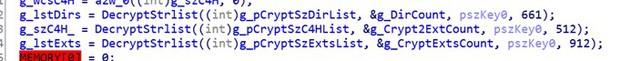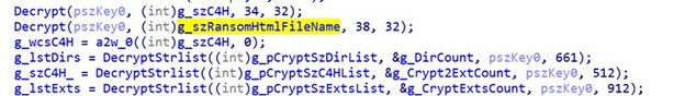 病毒含有勒索必要的资源,并且加密存在于病毒中,病毒代码通过解密用于之后的勒索操作,此举意在逃避安全产品的静态检测: