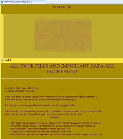 加密后,将加密所使用的UUID,使用之前生成的RSA公钥加密后,连同PersonID一同写入文件的末尾。整个文件加密流程采用的是源文件覆写的方式,所以不具备数据恢复软件恢复的可能性。文件数据被加密后,对文件名追加.C4H后缀。