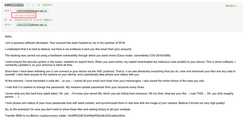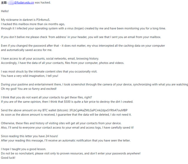 近日,恶意邮件在欧美国家部分高校及开云电子官网等教育机构用户的电子邮件系统传播。此类邮件并不含有恶意附件,其主要是通过社会工程学,利用人性弱点,恐吓收件人并勒索比特币。