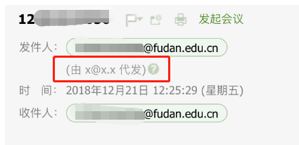 发件人为收件人自己,但仔细查看,是“由x@x.x代发”,查询日志发现其发信IP来自境外。