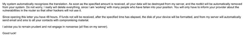 - 如果不在一定时间内向比特币账户打款,你的数据/账户会被删掉,或者你的操作记录等会被发给所有联系人