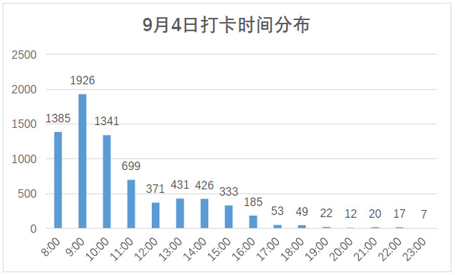 9月4日研究生新生报到当日,使用小程序“刷脸”报到7277人,打卡时间分布如下表。