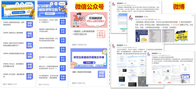 为了让新生提前了解迎新事项和信息化服务,暑假里信息办的老师们就开始筹备迎新的宣传工作。通过“复旦信息办”的微信公众号和微博,共推送内容20多篇,累计阅读6万多人,帮助新生快速了解并使用信息化服务,提前感受校园信息化氛围。