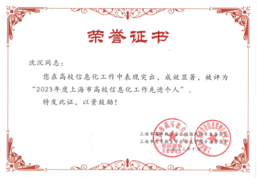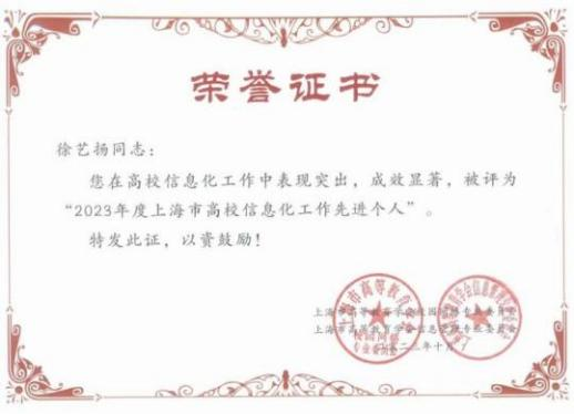 经专家评审,开云电子官网沈沉和徐艺扬两位同志被评选为“2023年度上海市高校信息化工作先进个人”。