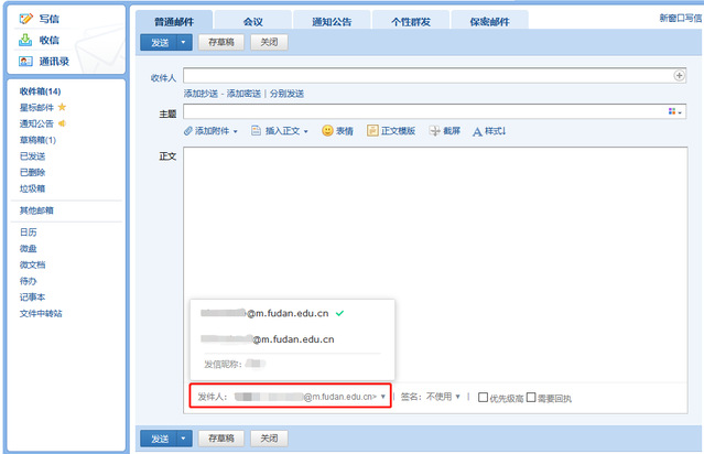 每个学生的学号云邮箱对应一个根据学生姓名与年级生成的别名邮箱。在“写信”界面的左下角点击“发件人”,可以在弹出的菜单中看到自己的别名邮箱(如下图),并选择别名邮箱作为发件人进行发信。