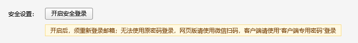 云邮箱支持“安全登录”功能,为邮箱提供更强的安全保障。该功能可在网页版邮箱中开启(“设置”->“邮箱绑定”->“安全设置”->“开启安全登录”)。开启该功能后,原有的密码将会失效,用户在网页版邮箱中只能通过微信扫码登录,不能使用密码进行登录。