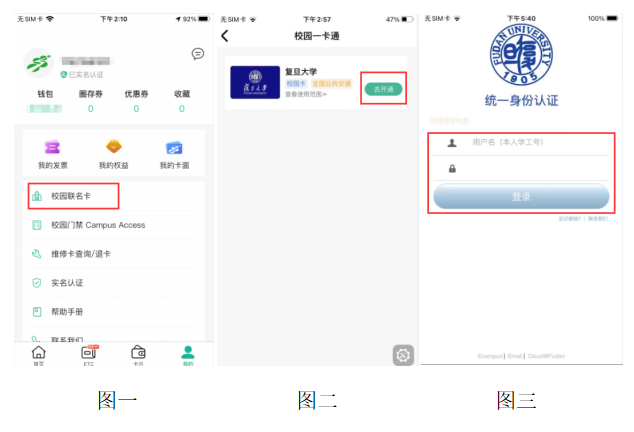 3. Click “My” → Select “Campus Co-Branded Card” (Figure 1) → Choose “Fudan University” → Click “Activate” (Figure 2).