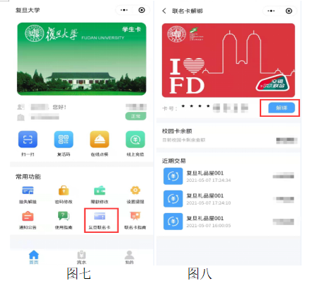 2. Click on Fudan Co-Branded Card (Figure 7) → Click Unbind (Figure 8) → Confirm by clicking Unbind .