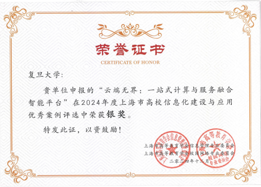 经专家评审,开云电竞平台app官方网站下载申报的案例“云端无界:一站式计算与服务融合智能平台”获得 2024年度上海市高校信息化建设与应用优秀案例银奖。