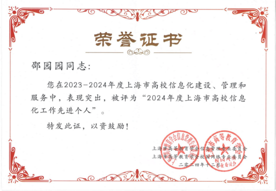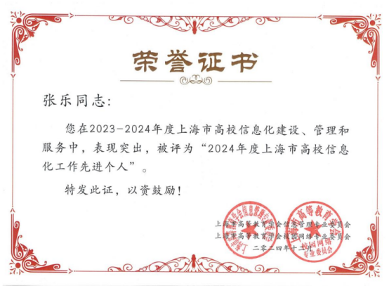 经专家评审,开云电子官网邵园园和张乐两位同志被评选为“2024年度上海市高校信息化工作先进个人”。